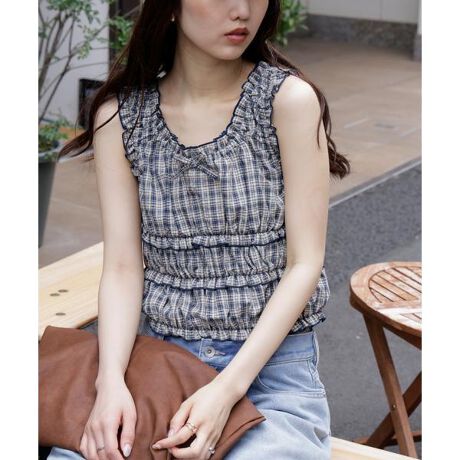 ゴムシャーリング端にメローを入れた可愛いブラウス。襟ぐりは少し広めにして夏らしいタンクトップ型になっています。伸縮性があるので、1枚着はもちろん、中にコンパクトTシャツとレイヤードも出来ます。小柄で麻調のチェック素材を使用。スウェットパンツ、デニムパンツ、カラーパンツやスカートにも着回せます。※モデルの着用画像の場合、光の当たり具合により、実際の色味と異なって見えることがございます。色味は、商品単体の画像をご参照ください。