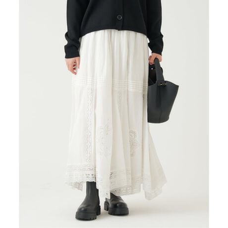 IENAオリジナルで作成した繊細で立体感のある刺繍が映える華やかな一枚です。 裾にかけて広がる美しいフレアシルエットと8枚接ぎによるパーツ刺繍は、繊細な生地の重なりを表現した裾のイレギュラーヘムがポイント。