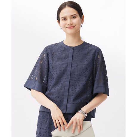 レースと無地の切り替えがポイントになったブラウス■デザインクルーネックの前開きレースブラウスです。ボクシーなラインと、やや広めのお袖でさらりと着て頂けます。襟ぐりと袖口、裾の切り替えには無地の別布を使用したデザインになっています。釦を開けて羽織りとしても着用でき、かしこまり過ぎずカジュアルに着こなせるレースブラウスです。■素材物性強度が高く耐光にも優れたポリエステル素材を使用しております。地となるネット目は引っ掛かりにくく、ポリエステル素材でありながらなめらかな風合いとなっております。どの角度からカットしてもほつれない組織になっています。■同素材アイテムパンツ(PRWMGA0203)ワンピース(OPWMGA0203)