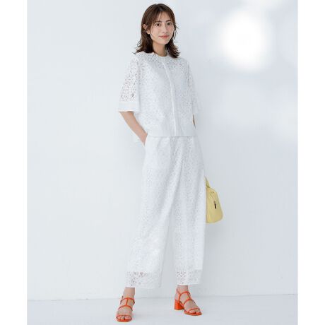 コーディネートの主役になる上品なレースパンツ■デザイン後ろゴム入りのややワイドストレートシルエットのパンツです。前から見た時の印象をすっきりと見せるために、前開きを作らずに脇開きファスナー仕様にしています。ヘルシーな透け感が上品でこなれた印象になるよう、ふくらはぎ中間あたりまで裏地をつけています。※モデル画像はサンプルを使用しております。実際にお届けする商品は裏地の長さが10cm長くなります。正しい仕様は物画像(モデル画像ではない画像)をご参照ください。■素材物性強度が高く耐光にも優れたポリエステル素材を使用しております。地となるネット目は引っ掛かりにくく、ポリエステル素材でありながらなめらかな風合いとなっております。どの角度からカットしてもほつれない組織になっています。■同素材アイテムブラウス(BLW7GA0203)ワンピース(OPW7GA0203)