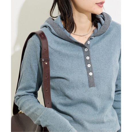 MILLERで人気のリブボーダー生地を使用した別注プルオーバー。深めのヘンリーと長めのお袖がポイントです。1枚で着用はもちろん、ジャケットなどのインナー使いもスタイリングのポイントになりオススメです。