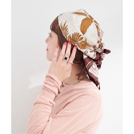 かごバッグや夏小物とも相性のよいニュアンスのあるカラー使いがポイントで、それぞれちがうモチーフをプリントしたスカーフです。バッグなどに巻くだけでポイントになり、コーディネートのアクセントになります。