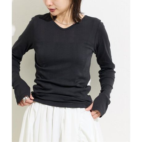 クルーネックからVネックに変更し、今年のトレンドエッセンスをプラス。長めのお袖とフィンガーホールがレイヤードにもピッタリのデザインです。
