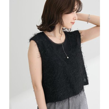 毛足の長いフェザーヤーン素材で仕立てたベスト。きらりと輝くスパンコールビーズを散りばめ、いつもの着こなしに加えるだけで華やかなスタイリングが完成します。短丈でどんなボトムとも相性がよく、ゆとりのあるサイズ感で快適な着心地も嬉しい。Tシャツにラフに合わせたコーディネートもおすすめです。透け感[ややあり]
