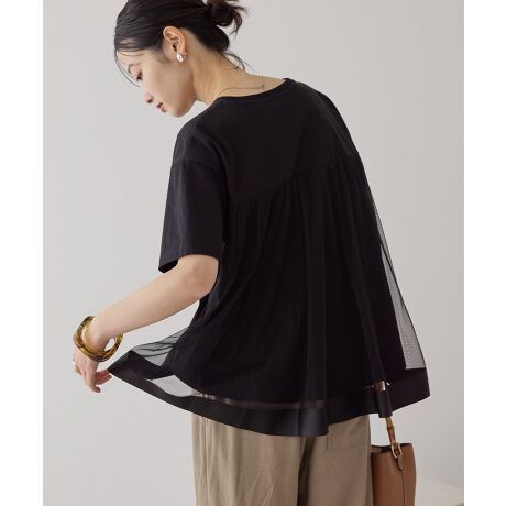 異素材デザインが魅力のレイヤード風プルオーバー。カジュアルなカットソーの後ろ身頃にエアリーなチュール素材をジョイントした洒落感たっぷりの1枚です。チュールの裾にテープを施すことでアクセントをプラス。程よく肉厚のコットン混素材で肌触り良く、ややゆとりを持たせたシルエットがリラクシーな着心地を叶えるデイリー使いに最適なアイテムです。透け感[なし]