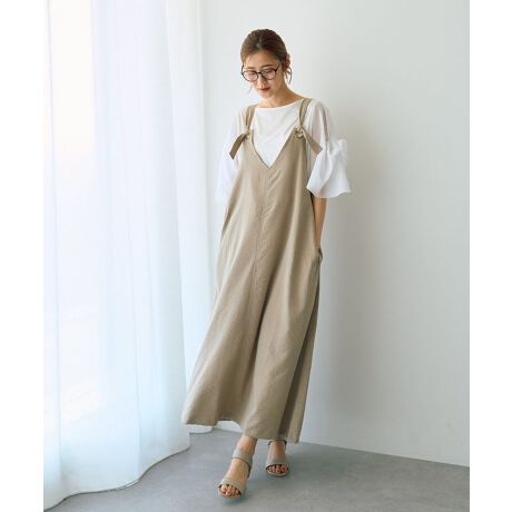 結び調節タイプの太めストラップとメタルリングでおしゃれなスタイルのサロペット。