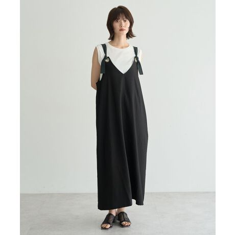 結び調節タイプの太めストラップとメタルリングでおしゃれなスタイルのサロペット。