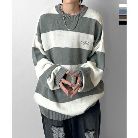 ILL’S ビッグシルエット ワンポイント刺繍 ボーダーニットプルオーバー