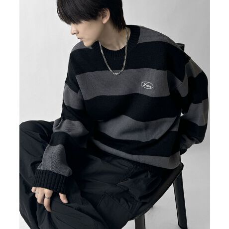 ILL’S ビッグシルエット ワンポイント刺繍 ボーダーニットプルオーバー