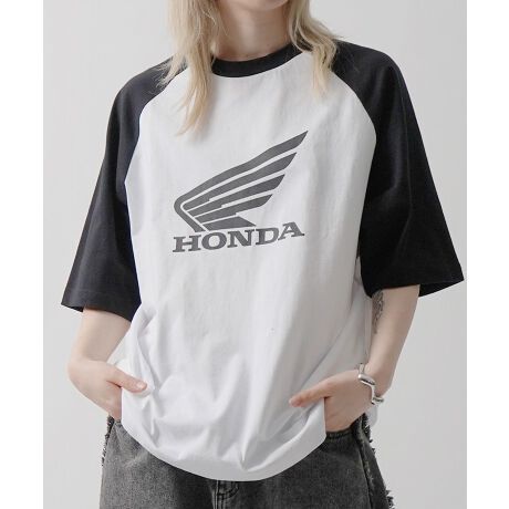 HONDAのシンボルマークをONしたラグランプリントTシャツ。