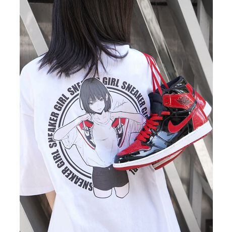 背中のサークルロゴには、レッド系スニーカーを掲げるガールが描かれ、印象的で目を引くデザインになっています。