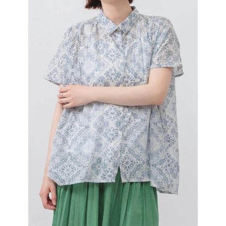 細やかなプリント柄が個性的な風合いを放つブラウス。