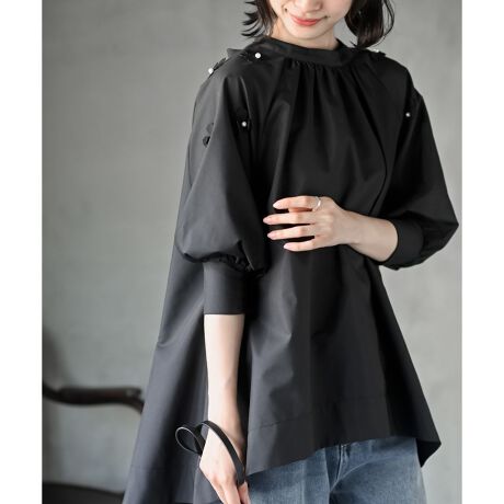 肩あしらったパール付きのフラワーモチーフがポイントのブラウス。