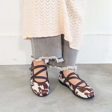 すっきりとしたフラットシルエットに、甲をやさしく支えるゴムストラップをプラスしたバレエシューズ。