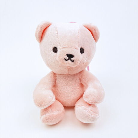 推しハグベアのサラッとタイプです。優しい手触りにすべすべな見た目がカワイイ♪首にヘアゴムをつけて缶バッチをつけると、推しをギュっとしてくれるデザインです。紐があるのでバッグに付けられてうれしい◎