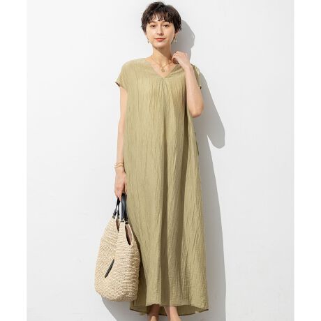 ニュアンスのある素材とシルエットがポイントのサックワンピース。凹凸のある軽い着心地の素材が、こなれた印象に見せてくれます。胸元はVネックで顔周りをすっきりと見せてくれます。脇から後ろにかけてタックを入れ、立体的なフォルムに仕上げました。後ろに抜いて着ると、こなれた雰囲気に。暑い夏にさらっと1枚で着られるカジュアルワンピースです。ご自宅での洗濯可能なイージーケアなのも嬉しいポイント。カラーは、涼し気なアイボリー(#002)、爽やかな差し色になるモスグリーン(#053)、上品なダルブルー(#074)の3色展開です。