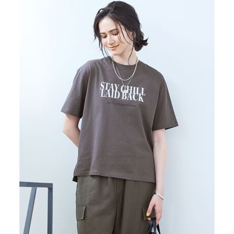 ベーシックなクルーネックのロゴTシャツ。裾にスリットが入っているのでボトムにインして着こなしやすいデザインです。SLOWらしいゆったりリラックスした様子を示す英文ロゴをプリントしています。2段のロゴが重なった部分は、STAY CHILL(くつろいでね)、LAID BACK(のんびりした)、下の小さいロゴは箔プリントでjust chilling at home(家でくつろいでるよ)、という意味のロゴです。オフホワイトxダークパープルロゴ(#001)、ラベンダーxオフホワイトロゴ(#082)、カーキxスレートロゴ(#054)、スレートxオフホワイトロゴ(#004)のオシャレな配色の4色展開です。