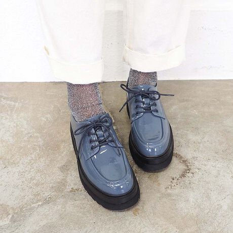 エナメルレザーのつや感が目を惹く、レトロモードなレースアップシューズ。