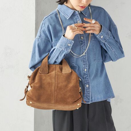 カジュアルからきれいめまでマッチするスエード素材のボストンバッグ