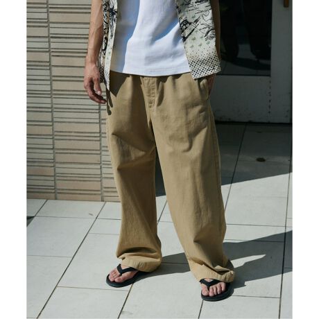 クラシックなワークパンツをベースに、ウエストサイズを大胆に拡張した新型のデザインパンツ。ウエストに配したスピンドル(紐)を絞ることで、ギャザーが生まれ、立体感と存在感のある唯一無二のシルエットが完成します。