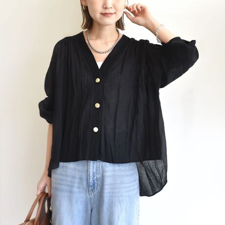 たっぷりとしたギャザーが素敵なブラウス見えするカーディガン。