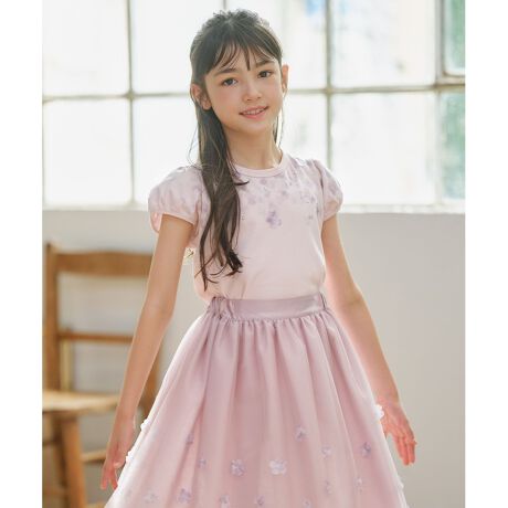 ■デザインふんわりとしたお花のプリントが胸元を彩る、ガーリーで上品なTシャツ。肩回りはパフスリーブで、可愛らしさを引き立てるデザイン。柄の中に立体モチーフのお花とキラッと輝くラインストーンがアクセントになっております。お出かけにも通学にも活躍する1枚です。