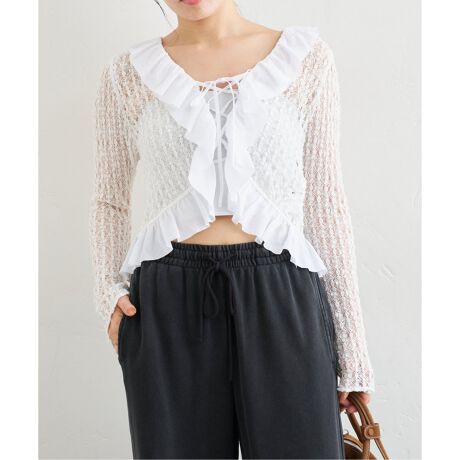 裾やネックまわり、袖口のラッフルデザインがポイントになった一着です。