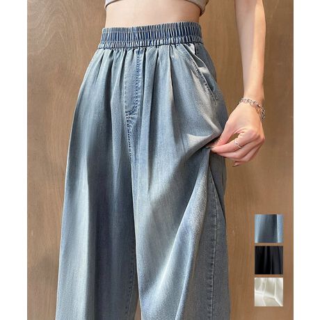 ドレープ感と軽やかさを兼ね備えた、夏にぴったりのデニム風ワイドパンツ。