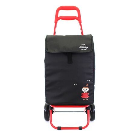 ムーミン、リトルミイ、スナフキンの保冷保温機能付きショッピングカート。背面には『MOOMIN』のロゴがプリントされています。さらに、背面にはファスナーポケットがあり、ファスナートップはムーミンの形をしています。側面片側にもポケットがついているので、すぐに取り出したものを収納するのに便利です。
