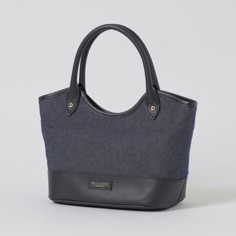 [型番:55140610__]◆異素材切替のミニトートバッグレザーとデニムライク生地を切り替えたミニトートバッグです。内装から覗くクレストブリッジチェックがポイントです。革のパイピングと、ハンドルの玉カシメがアクセントになっています。