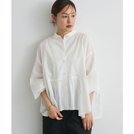 裾に動きがあるから、前だけタックインしてもサマになり、1枚で着映えが叶う万能ブラウスです。