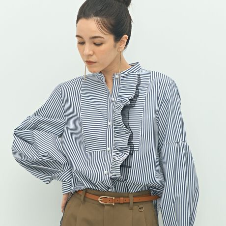・ビブヨークシャツに華やかな前立てのフリルを施した着映えブラウス
