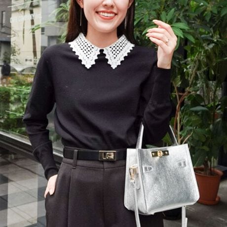 ・取り外し可能な白のレース衿がアクセントのプルオーバーニット
