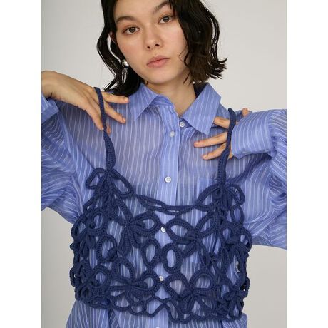 立体感のある網目がこなれた印象にしてくれるニットビスチェは手編みならではの味わいのある1枚。甘くなり過ぎない大人っぽいフラワーモチーフをチェーンのように繋げた大柄な模様で存在感あるれるアイテムです。コンパクトな丈感でバランスがとりやすくスタイルよく見せてくれます。インナー次第で色んな表情になれる近畿持っておきたいアイテムです