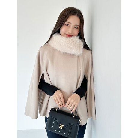 ドラマティックなAラインシルエットがスタイリングをレディに昇華する、昨年も人気のケープコートが今季もお目見え。今季は、ベーシックカラーに加えてキレイめな印象のバーガンディをプラス。腕をすっぽりと覆う美しいフレアデザインが、上品さをプラスします。程よく肉厚ながら軽さのあるウール混の生地で、ロングシーズン活躍する1枚に。顔まわりを華やかに彩る、襟のたっぷり優雅なファーはボタンで取り外しが可能です。ロングブーツを合わせたエレガントなスタイリングもおすすめです。左右にポケットが付いています。