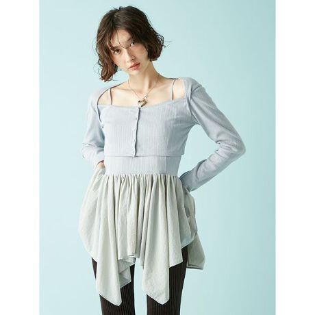 ペプラムディテールのミニ丈キャミワンピースとショートカーディガンがセットになった着映えアイテム。カーディガンとワンピースの上身頃は肌触りの良い針抜きカットソー、スカート部分は程よくハリのある布帛素材を使用。着映えと快適な着心地にこだわりました。カーディガンを羽織っても、単品使いしてもバランスよく決まる万能セットです。