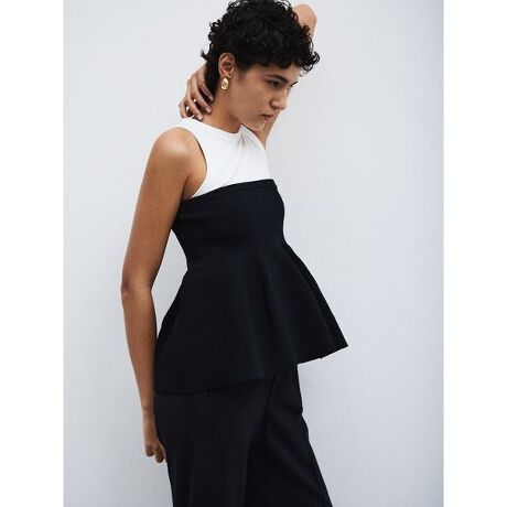 ベアトップは、ニットの編み地で立体的なペプラムデザインを構築。ふんわりと膨らんだシルエットで、ウエストからヒップにかけてしっかりとカバーできます。