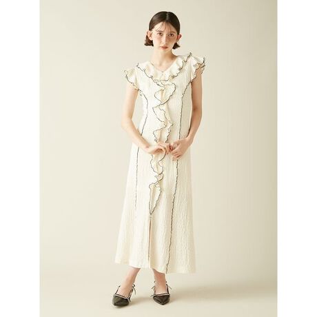 フロントに施したラッフルフリルがエレガントな印象を引き立てるワンピース。デコルテが美しく見えるVネックと、裾のスリットが抜け感をプラスします。気になる二の腕はフリル袖でさりげなくカバー。縦のラインを強調するシルエットで、全身をすっきり見せてくれるスタイルアップアイテムです。