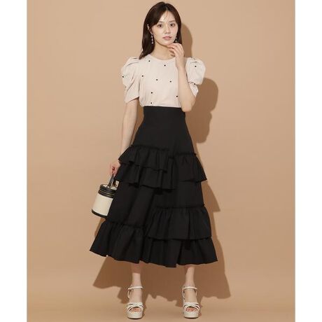 アシンメトリーなフリルが目を惹く、フェミニンムード漂うスカート【Design】・動くたびに揺れるボリュームフリルが、コーディネートに華やぎを添えてくれるスカート。・ウエストをきゅっと引き締め、裾にかけてふんわりと広がる美シルエットが魅力♪・後ろ姿まで美しく魅せてくれるレースアップ仕様で、女性らしさを引き立てます。・サイドファスナー付きで着脱もスムーズ◎・シンプルなトップスを合わせるだけで、こなれ感のあるスタイルが完成します。【Fabric】・裏地付き。・ホワイト、インディゴ、ブラックの3色展開となります。【Care】ドライクリーニング