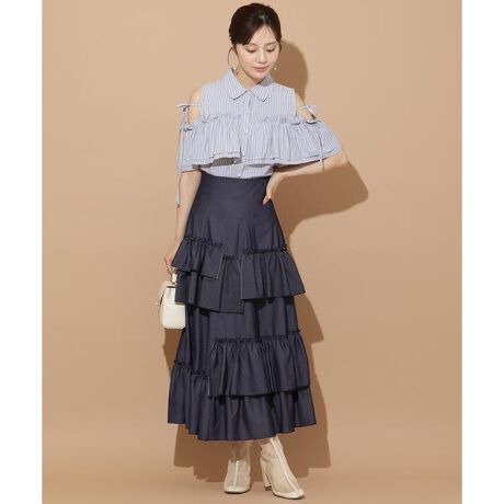 アシンメトリーなフリルが目を惹く、フェミニンムード漂うスカート【Design】・動くたびに揺れるボリュームフリルが、コーディネートに華やぎを添えてくれるスカート。・ウエストをきゅっと引き締め、裾にかけてふんわりと広がる美シルエットが魅力♪・後ろ姿まで美しく魅せてくれるレースアップ仕様で、女性らしさを引き立てます。・サイドファスナー付きで着脱もスムーズ◎・シンプルなトップスを合わせるだけで、こなれ感のあるスタイルが完成します。【Fabric】・裏地付き。・ホワイト、インディゴ、ブラックの3色展開となります。【Care】ドライクリーニング