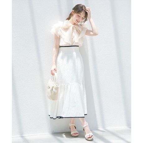 【透明感溢れるリーフ柄オパール素材が、品良く華やかに魅せる夏の主役スカート】【Point】・繊細なリーフ柄が浮かび上がるオパール素材を使用し、透明感と高級感を兼ね備えた一枚。・動くたびにふんわり揺れるティアードシルエットがフェミニンムードを高めます。・裾のパイピングが全体を引き締め、甘すぎない大人の印象に。・バックレースアップで後ろ姿まで抜かりなく。ウエストを体型に合わせたぴったりサイズに調節して着用いただけます。・シンプルなTシャツやカットソーと合わせれば、こなれ感のあるコーデが完成。ボウタイブラウスと合わせて、華やかなお呼ばれスタイルにも◎トップス次第で幅広いコーディネートを楽しめるスカートです。ケア方法:ドライクリーニング透け感:あり裏地:あり伸縮性:なし(ウエスト部分:後ろゴムあり)光沢感:なし生地の厚さ:薄手