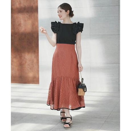 【透明感溢れるリーフ柄オパール素材が、品良く華やかに魅せる夏の主役スカート】【Point】・繊細なリーフ柄が浮かび上がるオパール素材を使用し、透明感と高級感を兼ね備えた一枚。・動くたびにふんわり揺れるティアードシルエットがフェミニンムードを高めます。・裾のパイピングが全体を引き締め、甘すぎない大人の印象に。・バックレースアップで後ろ姿まで抜かりなく。ウエストを体型に合わせたぴったりサイズに調節して着用いただけます。・シンプルなTシャツやカットソーと合わせれば、こなれ感のあるコーデが完成。ボウタイブラウスと合わせて、華やかなお呼ばれスタイルにも◎トップス次第で幅広いコーディネートを楽しめるスカートです。ケア方法:ドライクリーニング透け感:あり裏地:あり伸縮性:なし(ウエスト部分:後ろゴムあり)光沢感:なし生地の厚さ:薄手