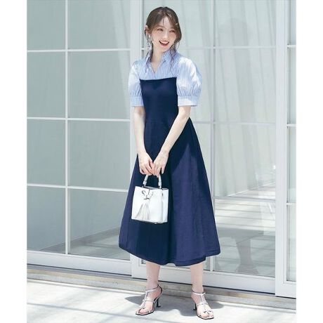 【ストライプシャツとの掛け合わせで好印象な大人カジュアルスタイルを作り出す、ニットドッキングワンピース】【Point】・ストライプシャツ×ニットドッキングが品の良い大人カジュアルスタイルに仕立てるワンピース。・スキッパーシャツが首周りをすっきりと見せ、かしこまり過ぎないほど良い抜け感を演出します。・軽いニット素材はシワになりにくく、暑い夏の日でもノンストレスな着心地◎・スカート部分は編地でメリハリを持たせ、裾に向かって自然に広がる立体的なフレアシルエットを構築します。ケア方法:ドライクリーニング透け感:なし裏地:なし伸縮性:あり光沢感:なし生地の厚さ:中肉