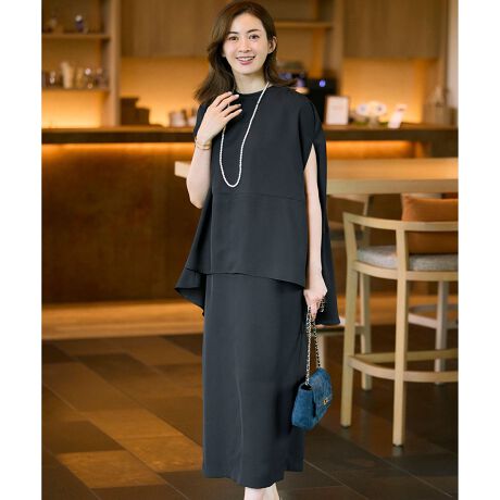 たっぷりとした分量感のフレンチスリーブブラウスとIラインのスリーブレスワンピースがセットになった商品です。ブラウスは、肩を覆うようにスリット状に開いた袖口や、ケープ風のフォルムが特徴のデザイン。さりげなく体のラインをカバーしてくれます。それぞれ単品でお手持ちのアイテムとの組み合わせもお楽しみいただけます。ちょっとしたお出かけや旅行、結婚式や二次会などの華やかなシーンにも活躍してくれます。カラーは、こなれた洒落感のあるモカ(#034)、シックな雰囲気が漂うブラック(#005)の2色展開です。