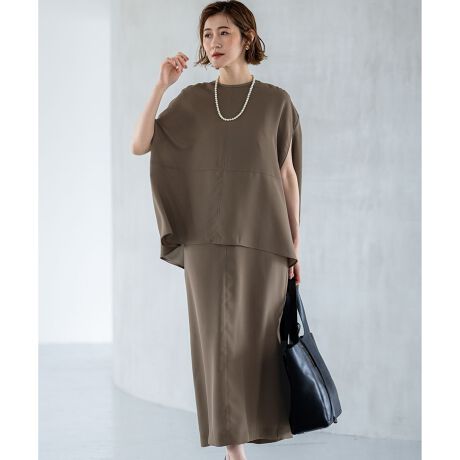 たっぷりとした分量感のフレンチスリーブブラウスとIラインのスリーブレスワンピースがセットになった商品です。ブラウスは、肩を覆うようにスリット状に開いた袖口や、ケープ風のフォルムが特徴のデザイン。さりげなく体のラインをカバーしてくれます。それぞれ単品でお手持ちのアイテムとの組み合わせもお楽しみいただけます。ちょっとしたお出かけや旅行、結婚式や二次会などの華やかなシーンにも活躍してくれます。カラーは、こなれた洒落感のあるモカ(#034)、シックな雰囲気が漂うブラック(#005)の2色展開です。