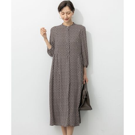 どこかクラシカルなムードのなかにモダンな雰囲気が漂うモチーフをちりばめたワンピース。襟元はバンドカラーですっきりと。ウエストやや高め位置で切り替えギャザーディテールをあしらうことで、裾にかけてフレア分量を調整することでスタイルアップを叶えつつ、ドラマティックな印象に仕上げています。カラーは、さりげなくやわらかなニュアンスを感じるダークブラウン(#535)、モノトーンの色合いでシックな雰囲気を加速するブラック(#505)の2色展開です。