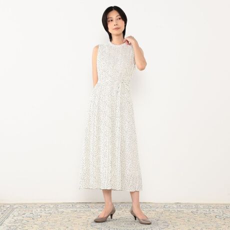 ◆デザインはランダムドット柄に細プリーツを加工したノースリーブワンピース 女性らしいふわっとした動きや立体感がしっかりとでるようなデザインが特徴です。