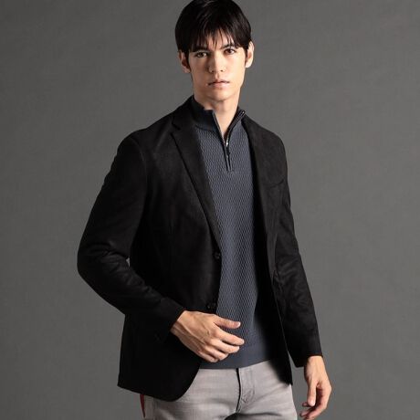 衿裏にタブベルトを装備し、ノーフラップポケットを採用した2つ釦シングルコンバーチブルジャケット。