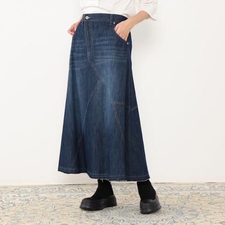 ◆デザインはパネル調に変則ステッチでランダムに切り替えを施したデニムフレアスカートです。ウエストはバックをゴム仕様に、すそは切りっぱなしでアンティーク調に。
