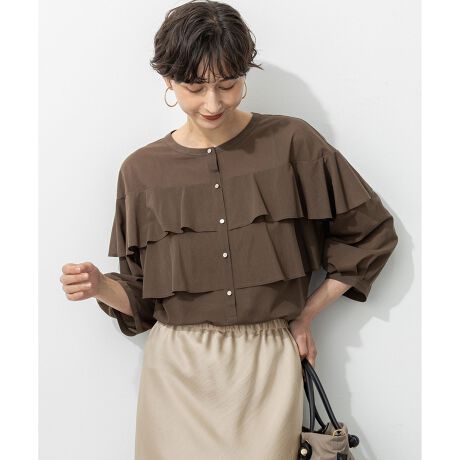 胸もとから袖にかけてドッキングされたフリルデザインが華やかなプルオーバー。フリルの分量を控えめにすることで、素材のハリ感を活かした立体感のある優雅なラインを形成し、甘すぎない大人の上品さを演出します。バンドカラーの襟と前立てが顔周りをすっきりと引き締め、洗練された印象に。オフィスシーンから普段使いまで、幅広いシーンで活躍し、着るだけでエレガントなスタイルが完成します。カラーは、印象が引き締まるブラック(#005)、柔らかい雰囲気のベージュ(#033)、ニュアンス感のあるカーキ(#054)、深みのあるブルー(#070)の4色展開です。